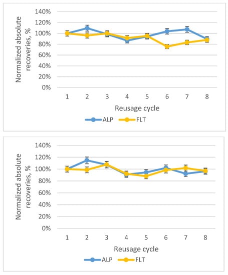 A factor that does not directly affect the extraction efficiency of the procedure but adds to its green character is the reusability of the adsorbent. Hence, two different vials were used, and the same protocol was followed for both of them. Eight cycles of extraction/elution were conducted within the same day, and the recoveries were found to be adequate at the 8th cycle. Therefore, the adsorbent could be used more than eight times. In Figure 15, the two diagrams of these vials are presented.