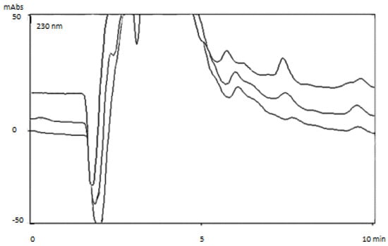 An LC-09 AD pump by Shimadzu (Kyoto, Japan) was used for the delivery of the mobile phase to the analytical column at a flow rate of 0.8 mL/min. A system of solvent mixing FCV-9A by Shimadzu (Kyoto, Japan) and a set-up of their degassing with He by the system of DGU-2A by Shimadzu (Kyoto, Japan) was used. Chromatographic separation was achieved isocratically in a Kromasil 100-5C18 (250 × 4 mm, 5 μm) analytical column (Seibersdorf Labor GmbH, Seibersdorf, Austria) at room temperature with ACN/H2O at a volume ratio of 50:50% v/v as mobile phase. The samples were injected with the help of an autosampler SIL-9A by Shimadzu (Kyoto, Japan) and detection was achieved at the wavelength of 230 nm by a Photodiode Array Detector SPD-M6A by Shimadzu (Kyoto, Japan). The software of the computer that was used was Class-M10A by Shimadzu (Kyoto, Japan).