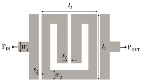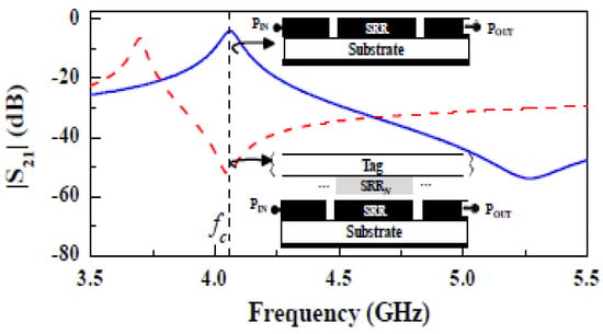 As previously mentioned, near-field chipless RFID systems comprise the reader and the tag. The sensitive part of the reader consists of a microstrip transmission line loaded with a square-shaped split ring resonator (SRR) in bandpass configuration [57,58], as can be seen in Figure 1. When the tag, consisting of a set of identical resonators to that of the reader but oppositely oriented, is located in close proximity to the sensitive part of the reader, coupling between the resonators arises, and the overall response is shifted down. A large excursion of the transmission coefficient at the design frequency generates a high dynamic range at that frequency, i.e., a high difference between two transmission coefficient values. In Figure 2, the unloaded reader allows the signal to be transmitted (equal to the ‘1’ logic state); meanwhile, the reader loaded with the tag resonator blocks and reflects back the signal (equals to the ‘0’ logic state). Note that the simulated response depicted in Figure 2 is a general solution of a tag formed with one resonator element and considering a Rogers substrate with characteristics shown in this figure caption.