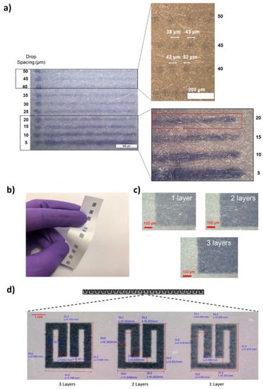 (a) Printed line topologies across a broad range of drop spacing; (b) inkjet-printed squares printed with one, two, and three layers; (c) zoom of the printed squares and (d) 20-bit tag and a zoom of one resonator printed with one, two and three layers.
