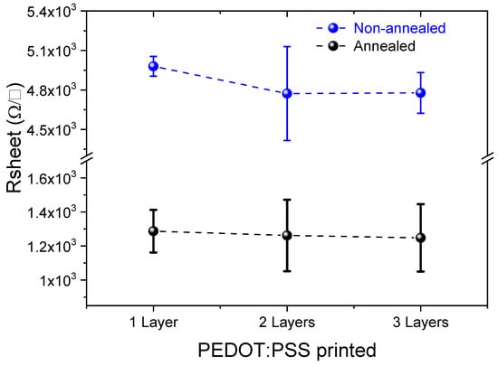 Van der Pauw measurements were carried out (Figure 4) for one, two, and three layers on paper in order to extract the sheet resistance. The study was conducted both with and without annealing the samples, since the paper is a temperature-sensitive substrate, although this step is used to remove the solvent. The thermal annealing treatment was carried out in the annealed samples by applying 110 °C for 45 min in a conventional oven. A noticeable effect in all the cases was the higher sheet resistance in the range of 103 Ω/square compared with the samples printed on polymeric substrates 15–400 Ω/square, because of the penetration of the ink into the cellulose hampering the conductivity. In addition, the increment of the layers contributed to the reduction of the resistance for both annealed and non-annealed samples. The annealing process led to a resistivity sheet resistance of 1.2–1.3 × 103 Ω/square, whereas the sheet resistance of the non-annealed samples increased to 4.9–4.7 × 103 Ω/square, where the absorption of the solvent was attributed to the cellulose fibers. Despite the higher sheet resistance, the removal of the annealing process brings new opportunities for using cellulose-based substrates while simultaneously producing a substantial reduction in the total cost of the tags. Thus, in our study, the RFID tags were fabricated without annealing.