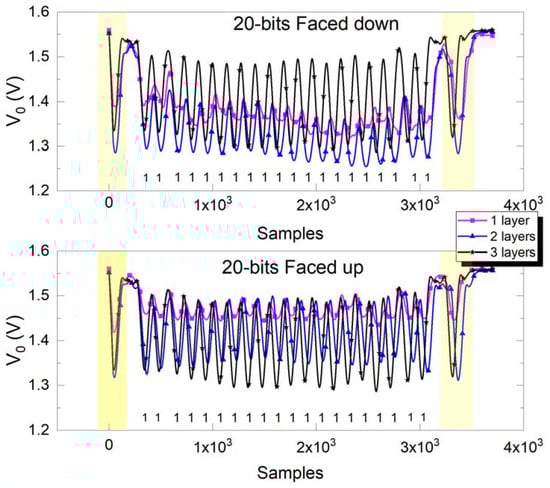 Another example of a 20-bit tag envelope signal is depicted in Figure 6. In this case, only two layers were printed, and it was enough to detect the ID code clearly. Note that when a bit is set to ‘0’, a very small variation of the envelope signal is observed because of the absence of a certain resonant element at their predefined position (the chain resonator is detuned). With these results, the functionality of the proposed tags, implemented by means of organic inks and printing two layers on ordinary paper substrates, was demonstrated.