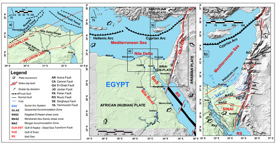 Compiled global tectonic sketch for Egypt and its surrounding regions (the middle plot: after [43]), the Nile Delta region (the left plot (a): after [44]), and the Sinai Peninsula and the Dead Sea regions (the right plot (b): after [45,46,47]). Abbreviations for the geographic features, faults, and shear zones are included in the legend.