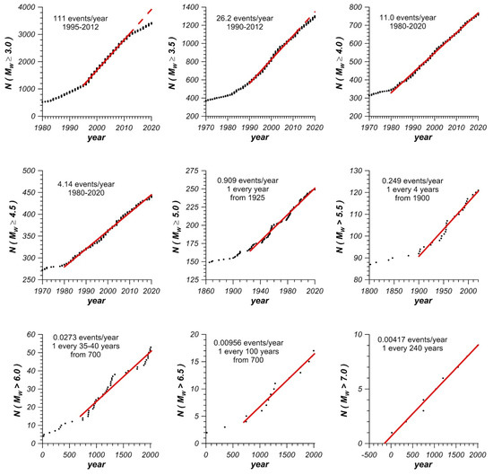 The completeness periods were estimated for the entire catalog. This was done by plotting the cumulative number of earthquakes for specific magnitude ranges against time (Figure 2). From the completeness analysis (Table 1), it was found that the catalog is complete for magnitudes above Mw 3.0, 4.0, 5.0, 6.0, and 7.0 broadly since the years 1995, 1980, 1925, 700 A.D., and 240 A.D., respectively. Some of the obtained completeness periods are closely related to the establishment or the improvement of some local and international networks. For instance, the years 1900, 1960, 1983, and 1993 are the approximates dates for the establishment of the Helwan Observatory in Cairo, the deployment of the World-Wide Standardized Seismograph Network (WWSSN), the installation of the Aswan Seismological Network around Nasser’s Lake, and the installation of the Egyptian National Seismic Network in Egypt after 12 October 1992, Mw 5.8 Cairo earthquake, respectively [55,56]. The given completeness periods for the current catalog indicate that our catalog is not as complete as could be desired. This is due mainly to the incomplete coverage of the seismic stations during the early instrumental period. Thus, some biases, underestimation, or overestimation for the seismicity parameters are expected during the computations.