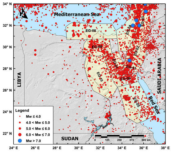 Egypt is characterized by earthquakes of moderate magnitudes which mainly concentrate along the surrounding plate boundaries (the Gulf of Aqaba–Dead Sea transform fault, the Gulf of Suez-Red Sea rift, and the Nubian–Eurasian plate boundary). Available publications and catalogs of historical (pre-1900) earthquakes in Egypt [48,57,58,59,60] document the occurrence of only 83 earthquakes in the Egyptian lands (Figure 3). In addition, the population concentration along the Nile River and its delta creates imprecision in the proper identification of the location and the possible damage effects of historical earthquakes. In Figure 3, the historical earthquakes that occurred in and around Egypt have been imported mainly from Sawires et al. [48] earthquake catalog and were plotted in terms of the computed equivalent moment magnitude using the relationships shown above. They documented the occurrence of about 230 earthquakes in and around Egypt within the period between 2200 B.C. and 1899 A.D., and within the intensity range of III to XI (MMI Scale) [48].