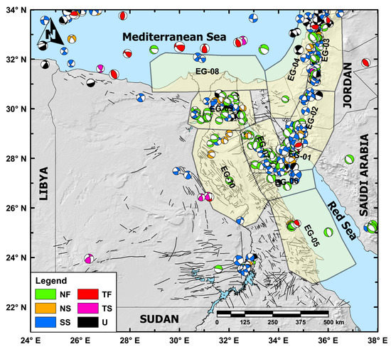 A recent database of focal mechanism solutions (1951–2019) has been provided in Rashwan et al. [61]. These focal mechanism solutions (Figure 5) have been used to study the seismotectonics pattern of the investigated region as well as to define and delimitate the studied seismic sources. Differentiation of the different faulting mechanisms based on their rake angle was considered (Figure 5), i.e., pure normal-faulting (NF), normal-faulting with strike-slip component (NS), pure strike-slip faulting (SS), pure reverse-faulting (TF), and reverse-faulting with strike-slip component (TS).