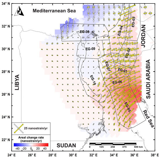 Rashwan et al. [61] also estimated the horizontal strain-rate field over a regular 0.5° × 0.5° grid. Considering such a horizontal strain-rate field (Figure 6), values up to ~25 nstrain/yr can be observed along the Gulf of Aqaba–Dead Sea Transform Fault with extension along with the WSW–ENE orientation, passing to SW–NE attitudes along the Red Sea basin. Along the region between the Nile Valley and the Red Sea, the strain field shows a NNE–SSW attitude with rates progressively decreasing westward. The Gulf of Suez shows values ranging from ~20 nstrain/yr (southward) to ~8 nstrain/yr (northward), while on the northern sector of the Nile, the shortening strain axes show an E–W orientation with values up to ~8 nstrain/yr.