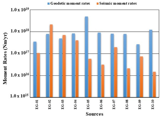 Keeping in mind these considerations, geodetic moment-rates for the EG-03, EG-08, and EG-10 sources should be considered with caution. Parameters and achieved results are reported in Table 3. Estimated values range in the interval 2.64 × 1017–4.93 × 1018 N·m/yr, with high values inferred for EG-05 and EG-10 seismic source zones, while low values were computed for sources EG-01 and EG-09.