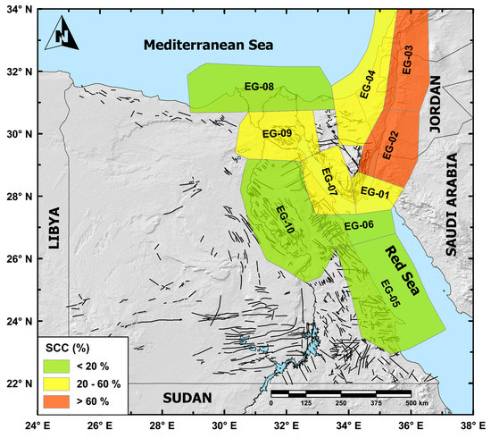 Another ratio range is observed for the sources EG-01, EG-04, EG-07, and EG-09 (Figure 8), characterized by moderate SCC values (between 20% and 60%). They defined the seismic activity along the southern Gulf of Aqaba, northeastern Sinai and eastern Mediterranean coast, the southern and central parts of the Gulf of Suez, and the Cairo–Suez district and northern Gulf of Suez, respectively (Figure 8). Therefore, these moderate SCC values are suggesting that these areas account for only an intermediate seismic fraction from the total budget of the deformation rate. Some of these seismic regions are characterized by well-known active faults that frequently generate moderate seismic activity such as in the Cairo-Suez district, the southern and central half-grabens of the Gulf of Suez.