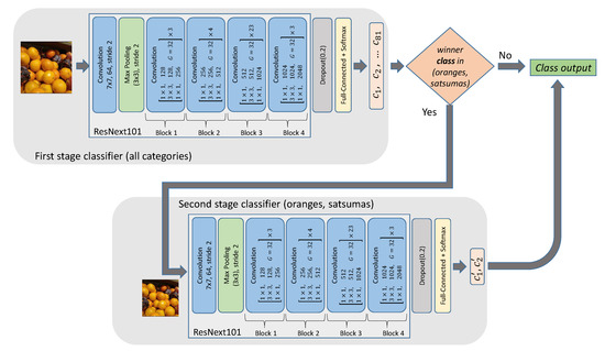 During the experiments, we noticed that two fruits, oranges and satsumas became very confused as they were very similar. In order to overcome this problem, a cascade classifier has been proposed, as shown in Figure 1, to classify oranges and satsumas again if the result of the first classifier was one of these two fruits. The result of the first classifier has 81 outputs (), while the second classifier only has two outputs ( and ).