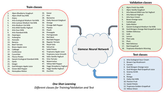 The second proposed procedure allows using Siamese networks to solve the one-shot learning problem. In an OSL problem, a single image is available for each category. An approach to solving this problem consists of training the model with some classes of the dataset and to validate it with a different group of classes. The test is finally carried out with a third group of classes. Figure 2 shows the category split that has been made. There are 50 classes for training, 18 for validation and 13 for test (81 totals).