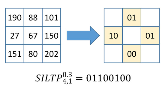 LOMO works with 10 × 10 sliding windows, with an overlap of five pixels, to process local blocks in 128 × 48 images. Within each window, two SILTP histogram scales ( and ) and a joint HSV histogram of 8 × 8 × 8 cells are extracted. is equal to the concatenation of N binary strings, obtained for N neighborhood pixels equally spaced on a circle of radius R with respect to the pixel . The binary strings are calculated by using the scale factor. From to , the binary string is when , when and otherwise. and are the gray intensities of pixels k and c, respectively. Figure 5 graphically shows an example of how SILTP is calculated.