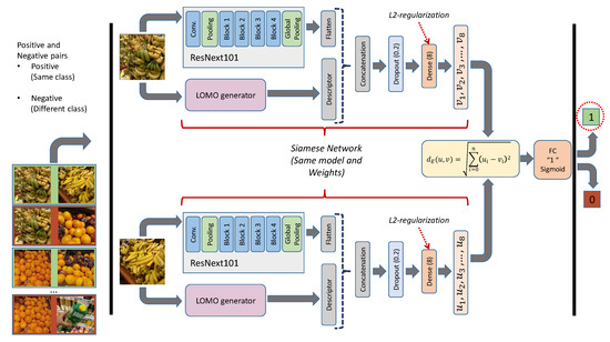 Figure 3 shows the scheme of this architecture. Each of the sister subnets shares the same ResNeXt-101 model with the same parameters. The model receives two images as input. The convolutional part of the ResNeXt-101 produces a feature vector in the last layer (). In a classification problem, this vector is connected to the Full-Connected (FC) layer with a Softmax activation. However, in this case, this vector is transformed into a single dimension (Flatten) and compared by Euclidean distance with the vector produced for another image (). In Figure 3, represents the Euclidean distance. The distance is then connected to another layer with a single neuron and sigmoidal activation, responsible for inferring whether the two images belong to the same category “1” or whether they belong to a different category “0”.