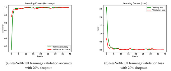 The next experiment consisted in adding a dropout layer with a random deactivation of 20% to the input of the last classification layer of the ResNeXt-101. This modification of the model improved the result up to 91.60% test accuracy, 93.60% precision, 92.20% recall, 92.18% balanced accuracy and 92.18% F1-Score. Figure 7a shows the training and validation accuracy, while Figure 7b shows the loss of this model.