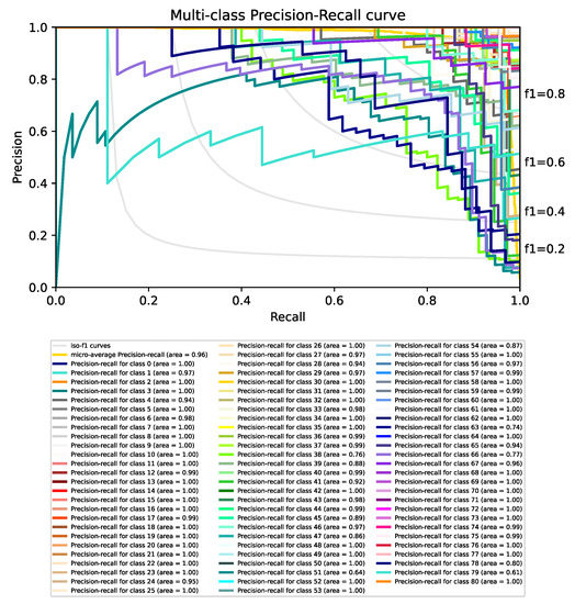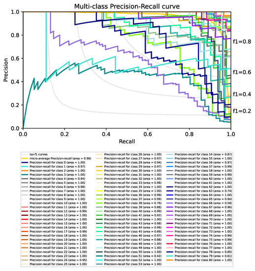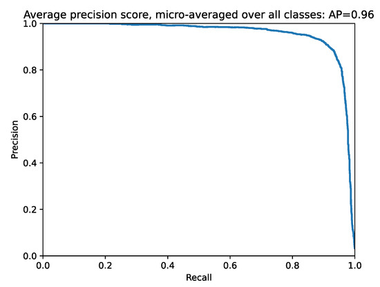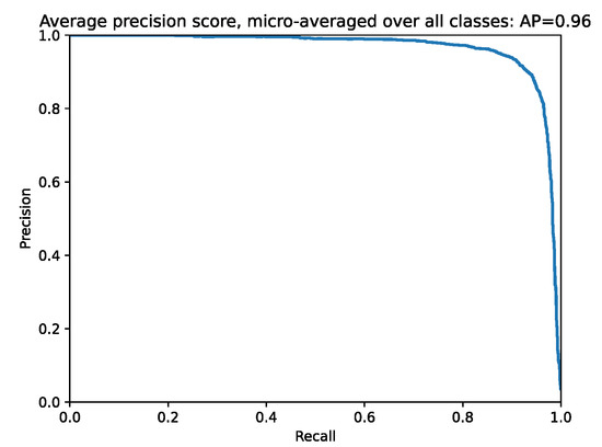A Precision-Recall curve with the average precision score micro-averaged over all classes is displayed in Figure 8. In addition, a Multi-Class Precision-Recall curve with all classes is displayed in Figure 9. The evaluation of the model shows a good performance, resulting in the 96% AUC (Area Under the Curve).