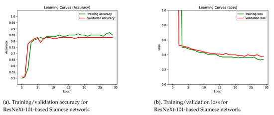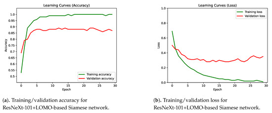 Figure 12a shows the training and validation accuracy for the Siamese net based on ResNeXt-101. Figure 12b shows the loss of this model. This model has been trained with an image shape of 299 × 299 for 30 epochs, and the weights for the first layers have been blocked using pre-trained weights for ImageNet [31]. The size of the batch has been 16, using a binary cross entropy loss and an Adam optimizer with a learning rate of 0.001. The best validation accuracy has been obtained in epoch five. The same parameters have been used for the LOMO and the ResNeXt-101+LOMO models.