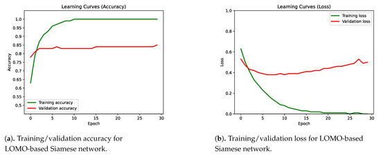 Figure 14a shows the training and validation accuracy for the Siamese net based on ResNeXt-101+LOMO. Figure 14b shows the loss of this model. The best validation accuracy has been obtained in epoch five. Again, the LOMO descriptors for each image are pre-calculated and the ResNeXt-101 part received images with shape 299 × 299.