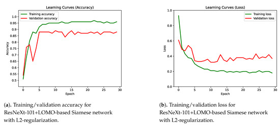 Another modification has included an L2-regularization in the dense layer. This technique is used to reduce model overfitting. The regularization has applied a penalty on the layer’s kernel and on the layer’s bias. For both penalties, the L2-factor has been . This regularization has reduced the gap between training and validation. Figure 15a shows the training and validation accuracy for the Siamese net based on ResNeXt-101+LOMO with L2-regularization. Figure 15b shows the loss of this model. The best validation accuracy has been obtained in epoch 10, with a maximum accuracy value of 0.95 and a maximum validation accuracy of 0.89.