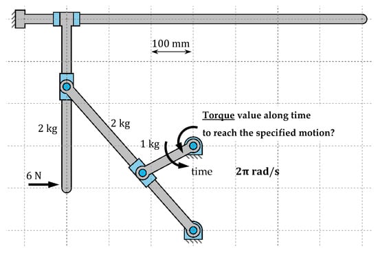 Apart from driving loads (known values in direct dynamics but unknowns in inverse dynamics), the student can define as many external resistant loads as desired. The available loads are punctual as well as linearly distributed forces and torques. In this module, to compute inertial loads, the properties of mass of each element need to be specified. The default values of the center of gravity and moment of inertia are automatically computed depending on the shape of the element, but because this shape is sometimes just a kinematic sketch (the real element may have a different shape), these defaults can be substituted by custom values. Elemental weights are also considered if a value of gravitational acceleration is defined. Figure 12 shows the proposed case study, and the value of the torque required over time to achieve a specific constant rotational velocity in the actuator under certain external loads.