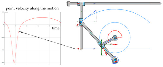 As shown in Figure 6, all results can be graphically plotted along with the mechanism at any position, which makes it possible to visually analyze their evolution during motion. It also becomes possible to evaluate the variation of any parameter along the time tracing the corresponding function.