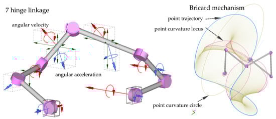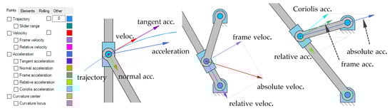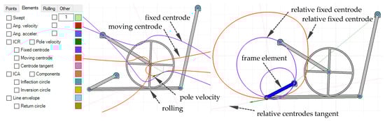 Apart from the main results, additional derived results are provided, such as the centers of curvature of the points, instantaneous centers of rotation of the elements, and fixed and moving centrodes. In addition, all results can be computed in terms of absolute motion or that relative to any moving element. Some of these additional capacities are shown in Figure 8, Figure 9, Figure 10 and Figure 11.