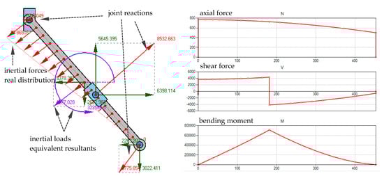 A number of additional results can be visualized apart from the above. In any dynamics problem, if the mechanism is non-redundant, a complete analysis of the force of the mechanical system is performed to compute the reaction forces and torques at the joints between elements. In addition, for linear elements, a diagram of internal efforts can be computed. As shown in Figure 13, the real distribution of weight and inertial forces along the element are considered. This force analysis is conducted for each position of the simulation, and thus the evolution of any of these results can be represented along the motion.