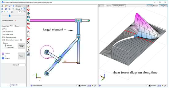 The student has the option of visualizing the values of any internal effort as a color map for the entire mechanical system at a position. Any internal effort diagram of an element can be also traced along time (motion), as shown in Figure 14.