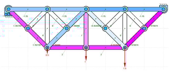 Other standard elements commonly used in dynamic analyses, like springs and dampers, are also implemented in the software to use to model mechanical systems. Because the methodology implemented has a general purpose, it is valid for a system with any number of degrees of freedom, including isostatic structures (mechanical systems with zero degrees of freedom and zero redundancies), such as the one shown in Figure 15.