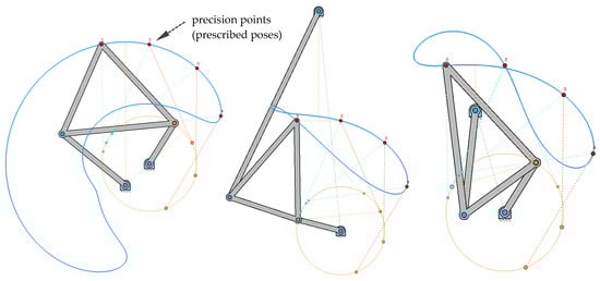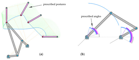 The synthesis module focuses on an approach to teaching based on four-bar linkage. It covers the main types of synthesis, i.e., path generation, rigid body motion, and function generation. Path generation synthesis establishes some precision points that must belong to the trajectory of the four-bar linkage coupler, as shown in Figure 17. Rigid body motion synthesis establishes poses in which the coupler element must be placed during its motion, as shown in Figure 18a. Function generation synthesis establishes relations between the angles of input and output that need to be satisfied as shown in Figure 18b.