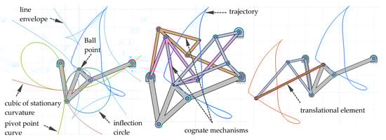 In any synthesis problem, some additional results are provided, such as the line envelope, cubic of stationary curvature, pivot point curve, the Ball point, or cognate mechanisms and their derivations. These are shown in Figure 19.