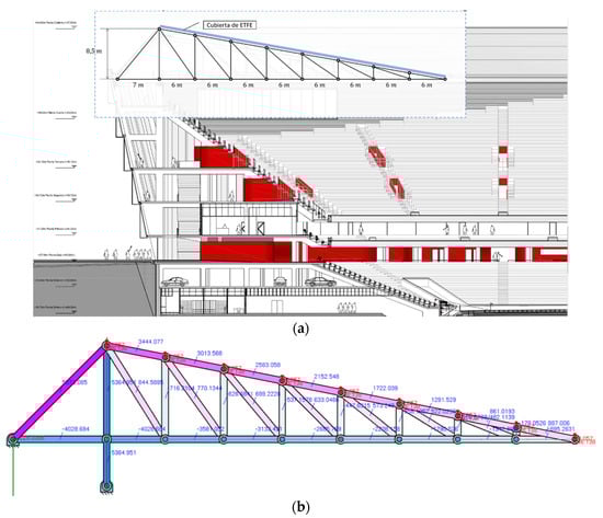 To illustrate the example of a case study proposed during these PBL activities, Figure 20 shows the rooftop of the San Mamés football stadium in Bilbao (Spain). The stadium is located in front of our university and is very well known to students. The objective of this PBL, which is among the activities designed through an educational innovation project in our Department of Mechanical Engineering (Ref: PIE2012/14), was to tackle the static problem of the truss that conformed to the structure of the rooftop. Figure 20a shows a floor plan of the truss of the rooftop, and Figure 20b shows a result obtained by a student. This consisted of reactions under specific loads.