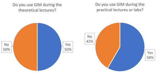 The use of GIM by professors/teachers is shown in Figure 24. As expected, it has more impact during the practical sessions than in the theoretical lectures. The professors/teachers score the usefulness of GIM as a complement to the lectures with 4.2 (scale 0–5).