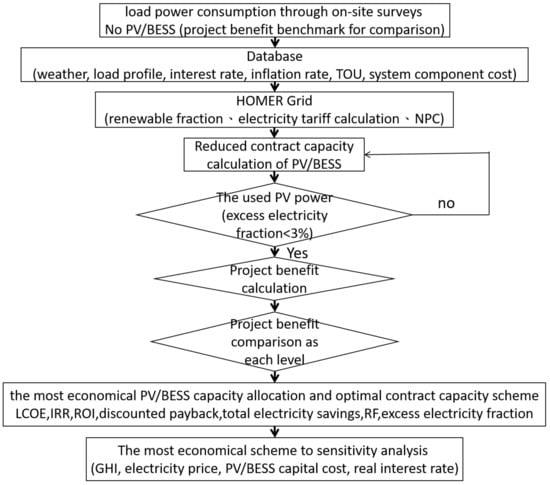 According to Taiwan’s policy of contracted capacity, the objective of the analysis shows the reduced contracted capacity related to the most economical PV/BESS capacity allocation and optimal contract capacity scheme under the condition that the electricity demand is met and the PV power generation is fully used. Figure 1 shows the flowchart of the economic benefit analysis. Without a waste of excess PV power, the excess electricity fraction is limited within 3% to the analysis and effective use of energy for the economic benefit evaluation of PV/BESS.