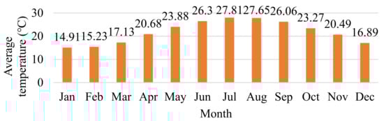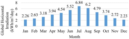 The weather condition relates to the latitude of 25.079° and longitude of 121.189° of the research site in this study into the HOMER Energy software to obtain NASA’s global horizontal irradiation data (GHI) and temperature statistics through the internet service. The area shows an annual GHI of 1.478 × 103 kWh/m2/year and the daily average GHI of 4.05 kWh/m2/day with abundant sunshine and is suitable for the development of PV applications. As shown in Figure 2, the average GHI of each month is from 2.23 kWh/m2/day to 6.84 kWh/m2/day. Figure 3 shows the average temperature of monthly temperature distribution with an annual average temperature of 21.69 °C, ranging from 14.91 °C to 27.81 °C. The highest and lowest temperature months are located in July and January, respectively.