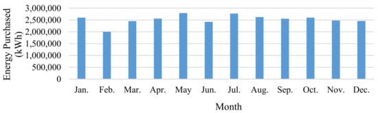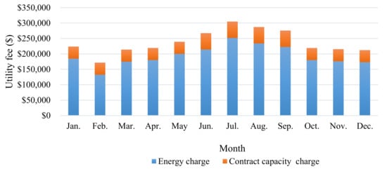 Figure 7 shows the electricity expenditure of the research site in each month in 2019. Related to the statistics of utility fees the total annual electricity cost is $2.85 × 106/year, including the energy charge of $2.321 × 106/year accounting for 81.42% and the contract capacity charge of $529.488 × 103/year accounting for 18.58%. The highest and lowest electricity rates locate in July and February (1.78 times between highest and lowest), and there is no penalty for electricity consumption exceeding the contract capacity of its full year.
