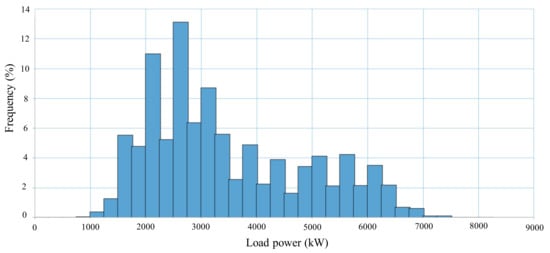 The load profile shows results based on the power data of users in 2019. The power data imported into the software is raw data, with each recorded every 5 min. The load power in the 24 h in Figure 5 is the average value of 365 days in each period. The peak power of 7378 kW is the highest load power ever experienced in the year. The user schedule of load consumption power shows an average of 3.463 MW. As shown in Figure 6, the frequency distribution of load consumption power can be accounted for by 60.13%, the most in this range between 1.75 MW and 3.5 MW. The frequencies locate the highest at 2.75 MW with accounting for 13.09%, the proportion of 7.11% at 6 MW or more, and the proportion of 0.1% at 7 MW or more. Therefore, if the energy storage system (PV/BESS) can provide a short time of 6 MW or more electricity demand, it can reduce electricity expenses for the contract capacity.