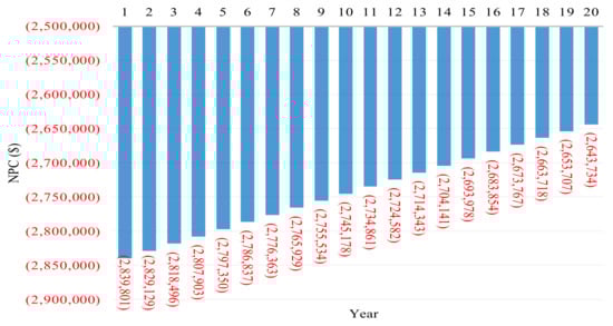 The NPC represents a life-cycle cost of components related to the values of installation and operation over the project lifetime in the HOMER Grid software. Total NPC indicates the summation of t-year cash flow over the annual real interest rate and initial capital cost during the project lifetime. For the t-year cash flow of definition, the expenditure and the income in the HOMER Grid software are positive and negative, respectively. In the above, the expenditure includes capital cost, operation cost, replacement cost, maintenance cost, etc., and the income includes electricity selling and component remaining value after the life cycle.