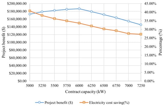 Figure 10 shows that when the contracted capacity reduces, more electricity charges can be saved. However, because the required capacity for PV/BESS increases, the equipment and maintenance costs will accompany by the increase to have lower project benefits. For example, the contract capacity sets at 5 MW which means the upper limit capacity of the utility power is limited to 5 MW. Therefore, the load maintain can let the system operate normally with the requirements of PV system capacity of 9 MWp and the BESS capacity of 2.25 MW/8.307 MWh, as shown in Table 5. Although the RF of contract capacity of 5 MW increases to 32.24%, the initial investment cost of the equipment has also increased by 1.22 times compared with the contract capacity of 6 MW, and the lower performance presents that the electricity charge is only reduction ratio of about 7% and the project benefit is $3.32 × 106. Although the installed capacity of the PV system is 7.25 MWp for the contract capacity at 7.25 MW, the best project benefit can be obtained with related to the lowest initial investment cost of the equipment in Table 5. The RF, electricity cost saving percentage and project benefit are all the lowest.