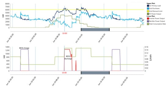 As an example to illustrate the electricity consumption in summer, it can be presented by taking the contracted capacity of 6 MW, PV capacity of 8.25 MWp, and BESS capacity of 1.25 MW/3.195 MWh. To TOU management, BESS charged during the off-peak period with low electricity price on 18 June as shown in Figure 11. The load power consumption appears at 6.179 MW, which is higher than the setting value of contract capacity, in the period with a high electricity price at 10:00 o’clock on the next day. Because of the energy management of power supply by PV system outputs of 3.856 MW and the BESS outputs of 1.25 MW, the immediate usage of main power drops to 1.073 MW. On the same day, the consumption of main power can be as low to 0 MW. In addition to meeting power demand, the solution can reduce main power consumption and electricity charge related to avoiding high fines due to load usage exceeding contract capacity.