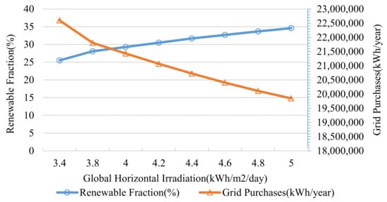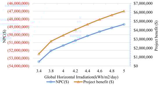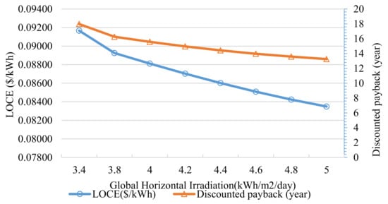 To sensitivity analysis, the simulation is set by GHI ranging from 3.4 to 5.0 kW/m2/day with the interval of 0.2 kW/m2/day. When the GHI increases, RF increases and grid purchases decrease in Figure 12, and the NPC decreases accordingly in Figure 13. When the expenditure of cash flow decreases, the project benefit will increase, and the LCOE and discounted payback will both decrease as shown in Figure 13 and Figure 14. According to GHI of 5.0 kW/m2/day, it results that RF rises to 34.6%, NPC drops to −$48.679 × 106, project benefit increases to $6.134 × 106, LCOE drops to $83.49 × 10−3/kWh, and discounted payback is reduced to 13.25 years. The longer sunshine time leads to higher investment benefits.