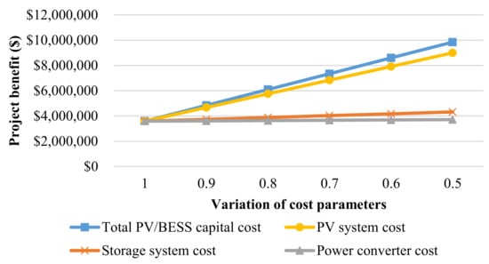 The sensitivity analysis of PV/BESS capital cost is divided into four parts: total PV/BESS capital cost, PV system capital cost, BESS capital cost, and PCS capital cost. The evaluation analyzes the impact on economic benefits under different cost conditions with a change ratio of 1–0.5 times and each interval of 10%. Figure 15 shows the economic benefits obtained are significantly higher than reducing the BESS or PCS capital cost by reducing the expenditure of the PV system capital cost. Because the capital cost of the PV system is higher than that of BESS and PCS in terms of the degree of impact on economic benefits. According to the analyzed result of Table 7, the project benefit can be increased by 30.09% if the expenditure of PV system capital cost is reduced by 10%. However, the project benefits will restrictively increase by 4.07 and 0.68% related to capital cost expenditure of BESS or PCS reduced by 10%, respectively. If the expenditure of total PV/BESS capital cost is reduced by 10%, the results at the ratio of 0.9 reveal that the project benefit increased to 34.84%, the IRR increased to 4.30%, and the discounted payback shortened to 13.83 years.