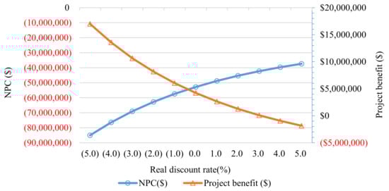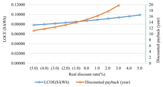 This analysis sets the real interest rate changes from −5% to 5% with intervals of 1%. From Equation (1) to Equation (5) and the analysis results shown in Figure 16 and Figure 17, it can be seen that a higher real interest rate leads to the lower present value of cash flows each year in the future. NPC will be seen as decreased, but the project benefit of PV/BESS will be decreased when the real interest rate increases. Therefore, LOCE and discounted payback will increase with the increase of the real interest rate. The analysis results of ROI and IRR can also be obtained from Equations (8) and (9), which are calculated by using the annual cash flow value without considering real interest rate, so it is not relative to real interest rate changes. In Figure 16 no more data point of discounted payback at an interest rate of 4% shows the 20-year payment with the PV/BESS scenario is much more than that without PV/BESS, so the project benefit is negatively related to the recovery period already more than 20 years.