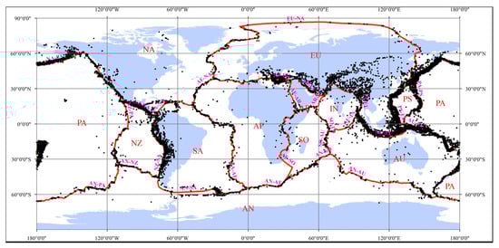 For demonstration purposes, the locations of earthquake events with magnitudes greater than 5.6 are shown in Figure 2. A global set of plate boundaries that contains 52 plates is presented by Bird in digital form []. However, the dataset is too meticulous to meet the needs of this study because it contains many small plates that do not have enough earthquake events. Thus, based on the dataset, new plate boundaries are formulated based on the USGS (http://volcanoes.usgs.gov/about/edu/dynamicplanet (accessed on 29 June 2018)) model, which contains 12 plates in total (Figure 2).