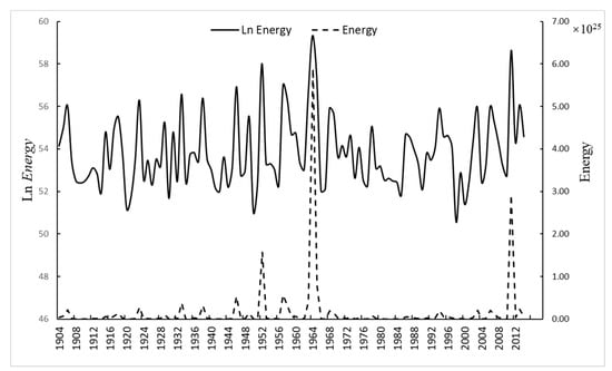 The following procedure employs the annual energy release after transformation into natural logs from 1904 to 2014 of 28 plate boundaries, as shown in Figure 3. The augmented Dickey–Fuller (ADF) test is the most frequently used unit root test to examine the stationarity of time series. It is an extension of the DF test, which is a parametric approach originally proposed by Dickey and Fuller [,]. Although the method is questioned by some studies, it is still one of the most widely used methods. In addition, Akiboade anticipated that many unit root test methods would support the same conclusion if a sufficient sample size was used. Therefore, ADF was used to test the stationarity of the energy release at all plate boundaries, and the results are presented in Table 2.