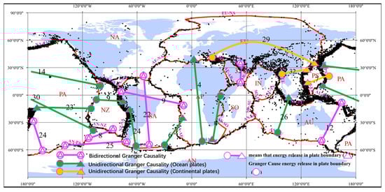 The existence of a cointegrating relationship among energy releases at plate boundaries suggests the presence of Granger causality, at least in one direction, but it does not suggest the direction of causality between plate boundaries. In other words, the existence of causality in either direction cannot be ruled out. The direction of Granger causality would be determined by a traditional F test through constructing a VAR model and its associated probability value. Based on the Akaike information criterion (AIC), the optimal lag length was chosen []. As shown in Table 3, the F-statistics and the associated probabilities permit us to reject the null hypothesis that there is non-causality between the two plate boundaries. Therefore, there is unidirectional Granger causality between two plate boundaries, such as from PA-PS to NZ-PA, from PA-PS to AN-PA, from AU-PA to NZ-PA, from NA-SA to NZ-PA, from NZ-SA to AN-SA, from SA-AF to AN-SA, from AN-AF to AF-SO, from AF-EU to AN-AF, from PS-EU to PA-PS, from PS-EU to AF-EU, from PS-EU to IN-EU, and from AU-EU to AN-AU. This list means that the energy releases at the former plate boundaries are the Granger causes of the energy releases at the latter. In addition to this result, there is bidirectional Granger causality between some pairs of plate boundaries, such as between AN-PA and AU-PA, between AN-SA and SA-NA, between NZ-SA and SA-AF, between SO-AR and AR-EU, between AN-PA and AN-NZ, between AN-PA and AN-SA, and between AN-AU and AU-PA. In addition, the results were highly significant. For demonstration and visualization, a map of Granger causality between energy releases at plate boundaries is reported (Figure 4).