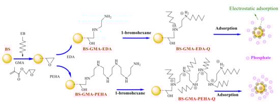 BS-GMA-EDA-Q and BS-GMA-PHEA-Q adsorbents were prepared by RIGP, and the synthesis process is illustrated in Figure 1.