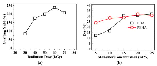 The RIGP technique is mainly dominated by free radical mechanism. The total amounts of free radicals generated in the substrates and the monomer is the main factor affecting the GY. Figure 2a shows the radiation dose effect on the GY. The GY increases with the dose, and it reached a maximum of 239.6% at 60 kGy. However, the GY of GMA decreased when the radiation dose increased above 60 kGy. These phenomena can be explained by the decay mechanism of the trapped radicals. The grafting polymerization was mainly controlled by the total amount of free radicals formed in the substrates. The high adsorbed dose will initiate more free radicals, thus introducing a high GY. Nevertheless, the grafting occurred only at the interface of the substrate and solution, so GY no longer increases with the dose increasing, the decomposition of cellulose molecules was also intensified [28]. The multiple influence factors result in the decrease of the GY. In this study, the grafted BS with the GY 239.6% at 60 kGy were selected for further experiment.