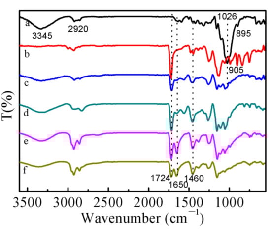 FTIR spectra of original BS (a), BS-GMA (b), BS-GMA-EDA (c), BS-GMA-PEHA (d), BS-GMA-EDA-Q (e), and BS-GMA-PEHA-Q (f).