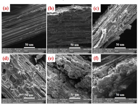 SEM photographs of the spectra of BS-based adsorbents are shown in Figure 4. The surface structure of BS demonstrated ordered fibrils and no other substance attached because lignin was removed by NaOH treatment. After GMA grafting, the cellulose fiber’s regular arrangement on the BS surface was destroyed (Figure 4b). After chemical modification by EDA and PEHA and further quaternization, the BS surface became rough due to the GMA graft polymerization and linkage of multiple amine chain attached to the BS surface (Figure 4c,d). After quaternization, the surface became rougher because of the immobilization of 1-bromohexane. The surface changes of BS before and after grafting, combined with the infrared spectra, confirmed that the chemical modification was successful.