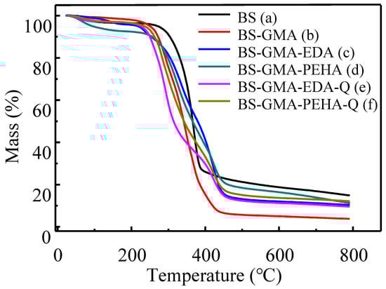 TG analysis for BS (a), BS-GMA (b), BS-GMA-EDA (c), BS-GMA-PHEA (d), BS-GMA-EDA-Q (e), and BS-GMA-PHEA-Q (f).